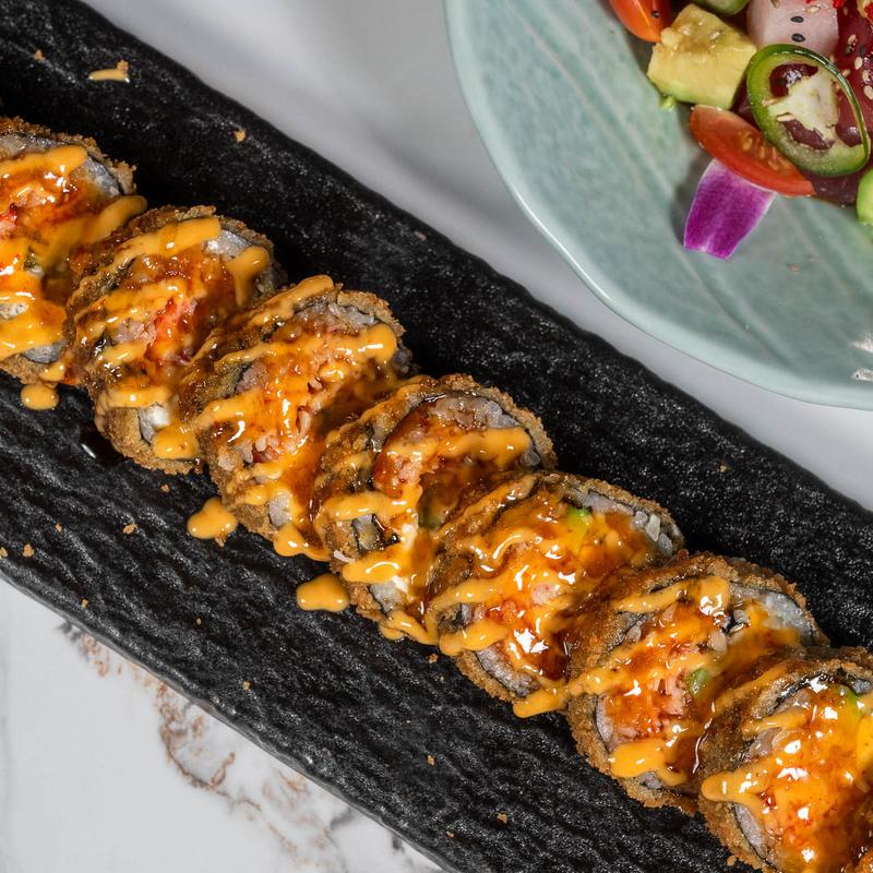 Deep fried roll with spicy salmon, cream cheese, and avocado inside with spicy mayo and eel sauce on top.