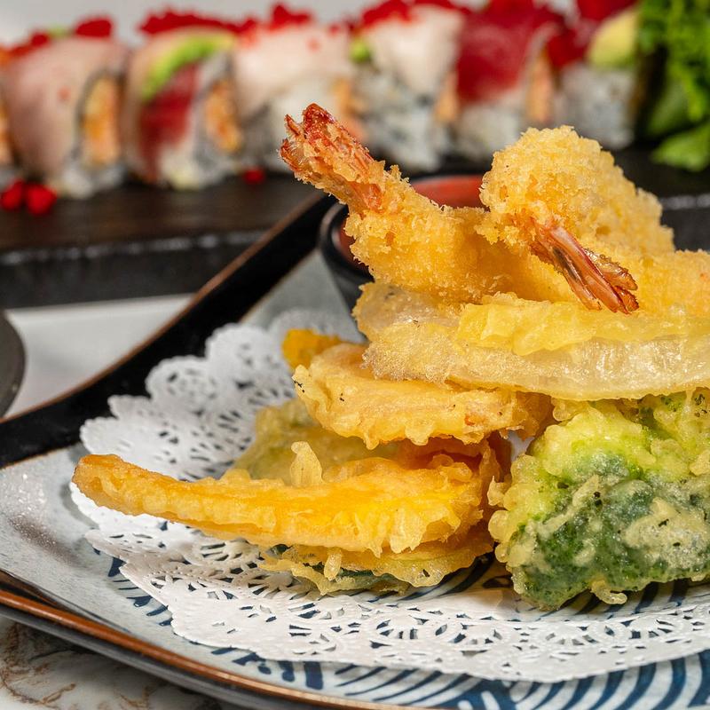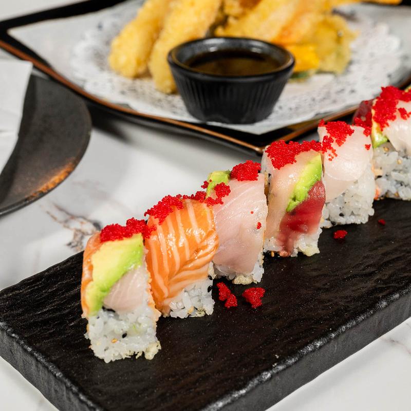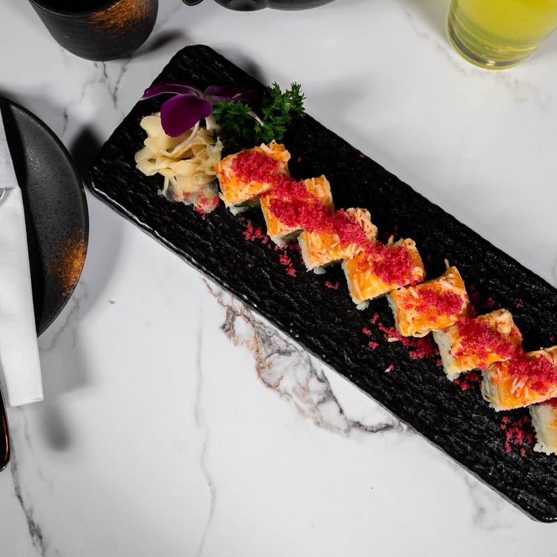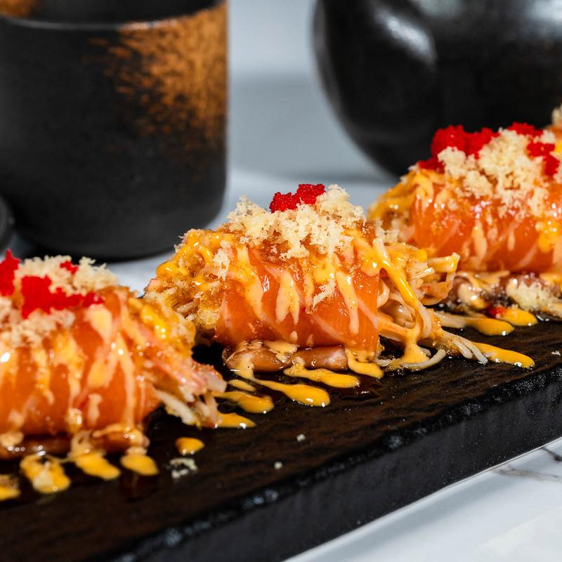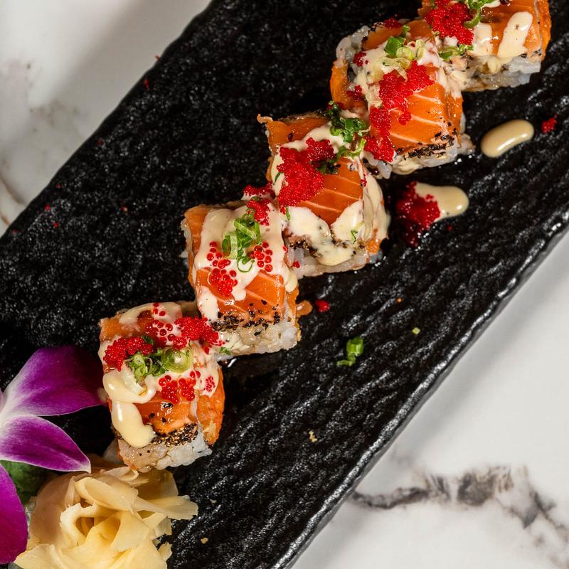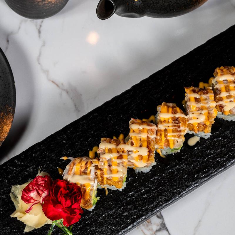 Inside salmon tempura, mango, avocado, and cream cheese topped with eel sauce, spicy mayo, and wasabi mayo.