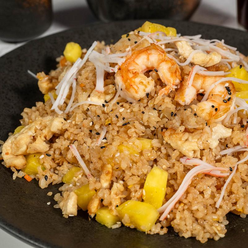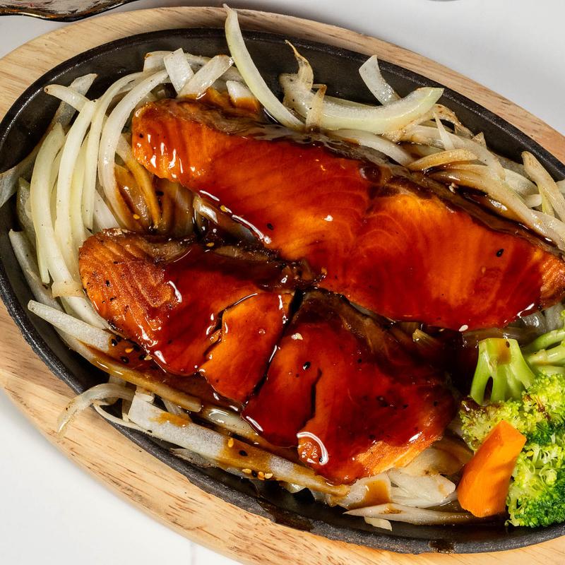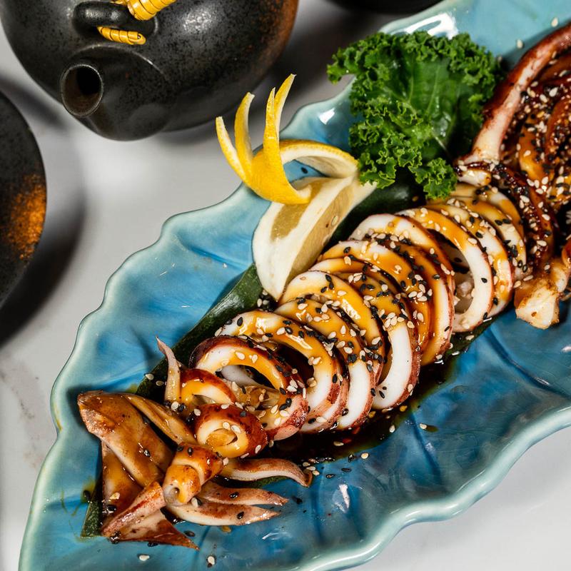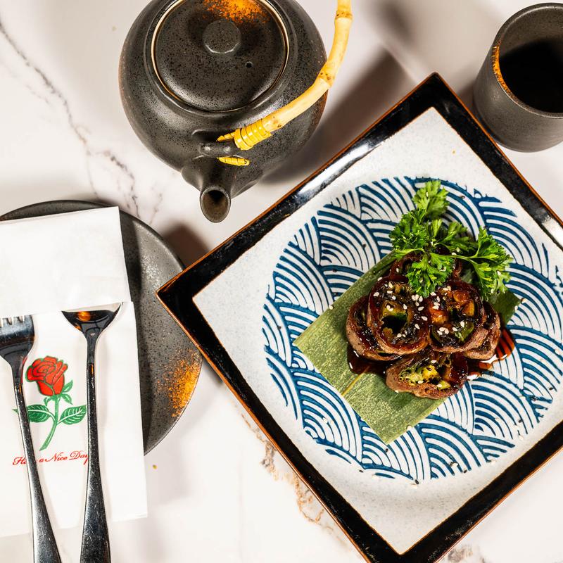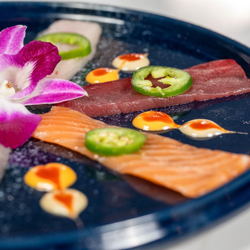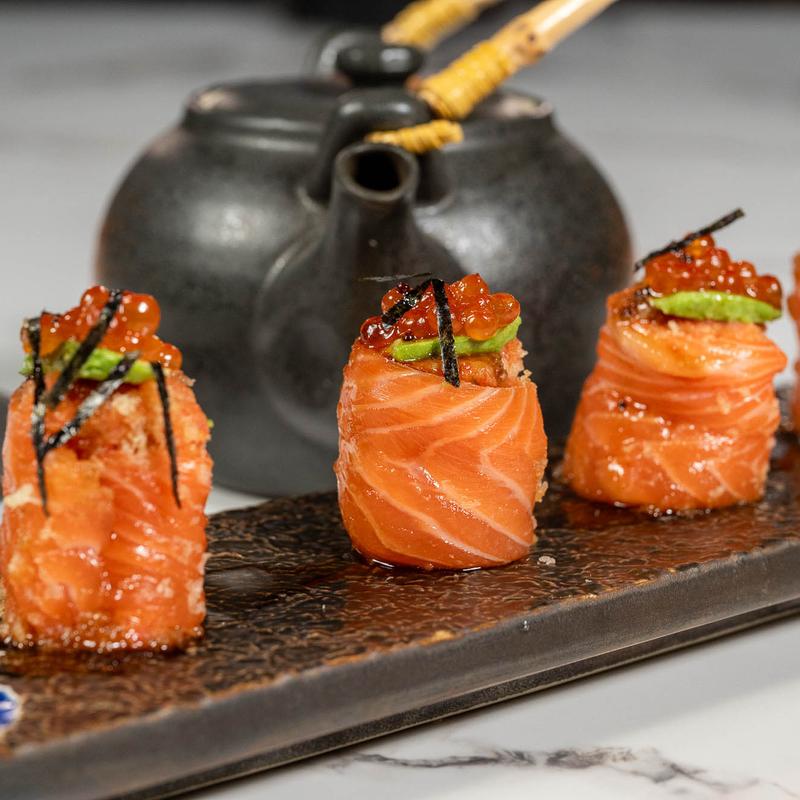 Inside salmon tempura, mango, avocado, and cream cheese topped with eel sauce, spicy mayo, and wasabi mayo.