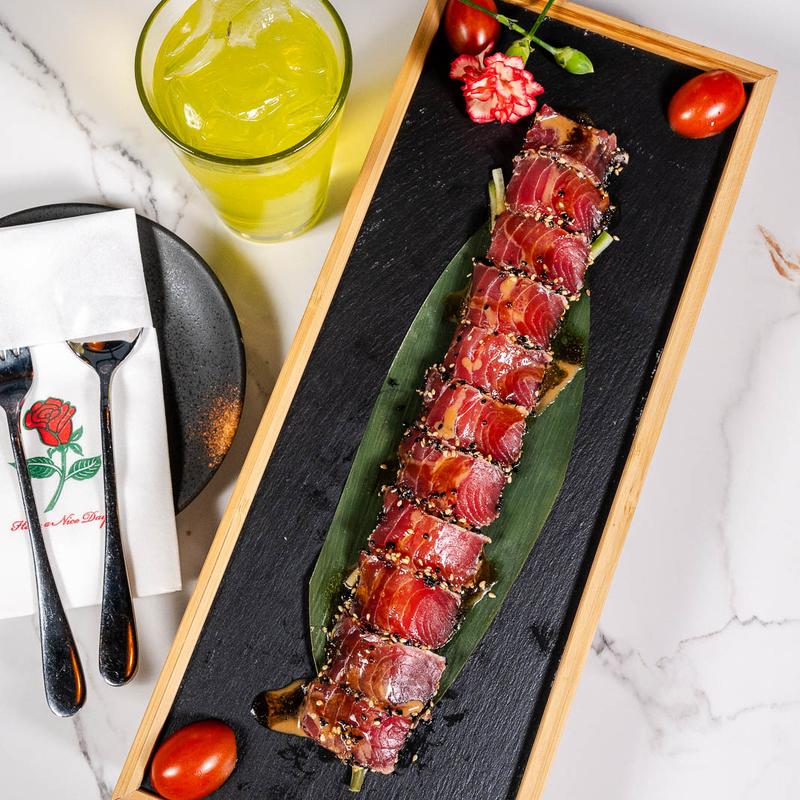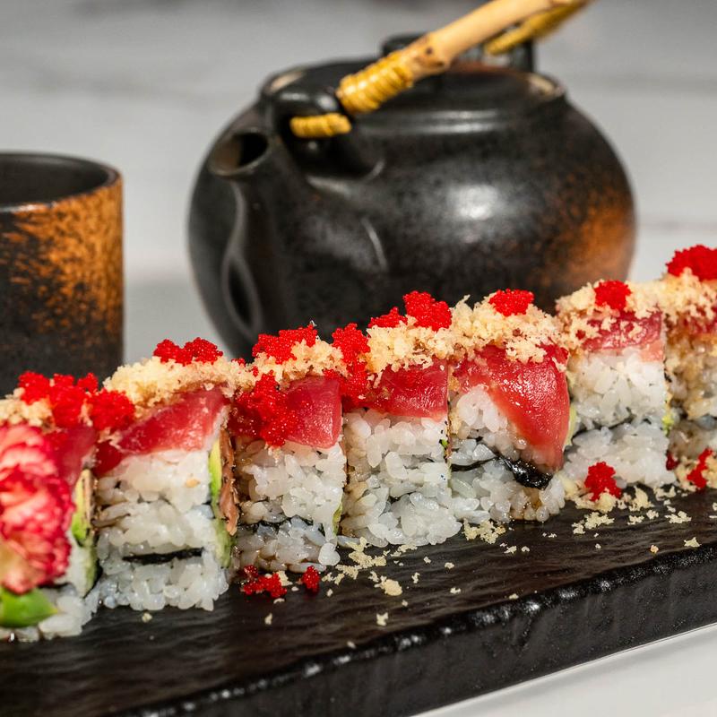 Shrimp tempura, spicy tuna, and avocado inside wrapped with soy paper, with chef's special on top.