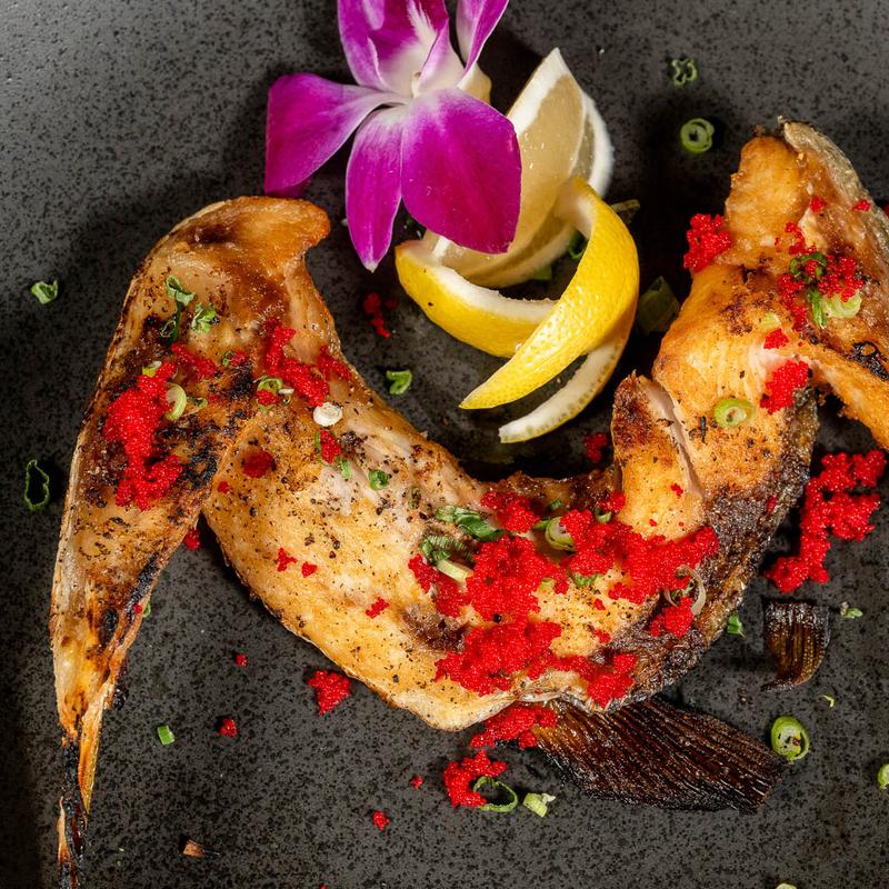 Deep fried roll with white fish, tuna, salmon, crab, cream cheese, and avocado inside, with chef's special sauce on top.