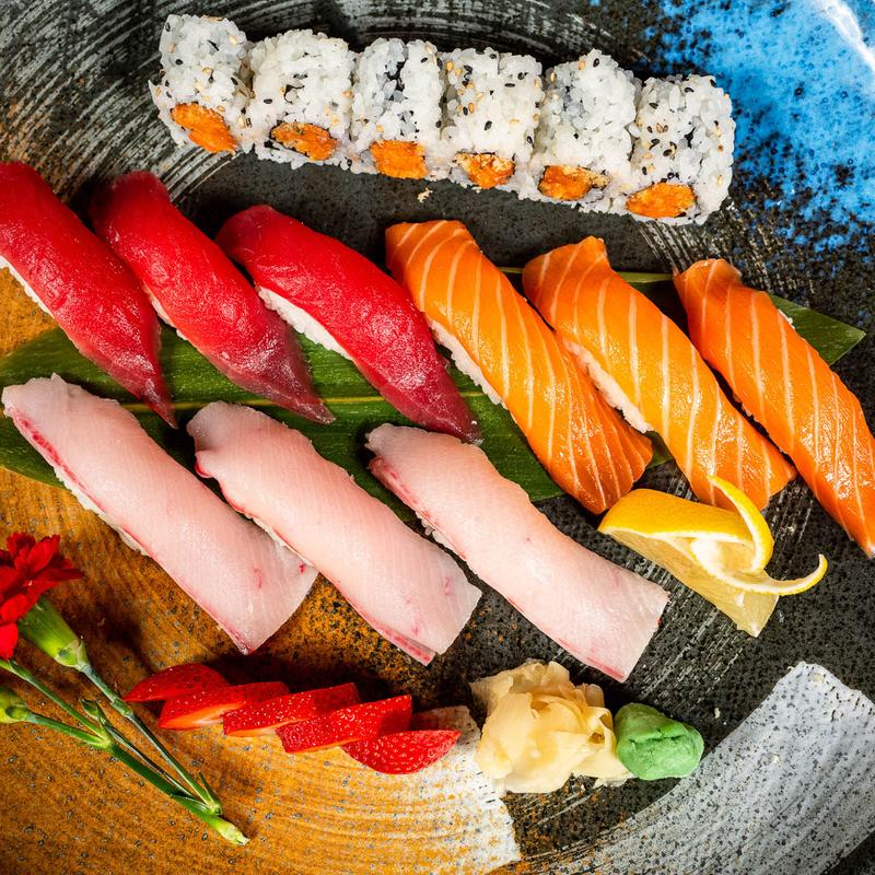 4 Pieces of sushi, 6 pieces of sashimi, and California roll.
